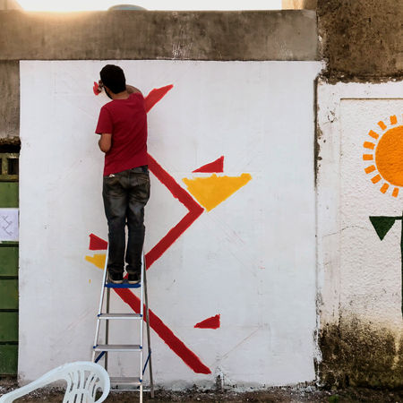Beginning with a brief introduction to the objectives, techniques and safety considerations participants swiftly divided into teams to collaboratively translate five designs to the walls. The simplicity and clear definition of the designs meant that the painting process could be undertaken with a high level of autonomy. In the afternoon local kids were involved in painting butterfly patterns on an existing mural.